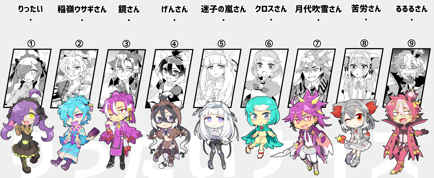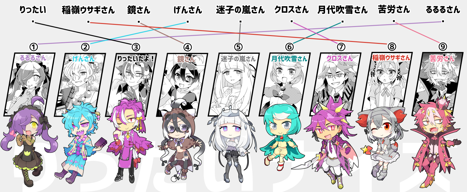 予想してくださってた方が「③はデフォルメ絵が一人だけ目線がこっち向いてないのが気になった」と仰っていて言われてみればたしかにデフォルメ絵も白黒絵も③だけ目線合わねえ!感あって完全無意識で描いていたので面白いなと思いました…!