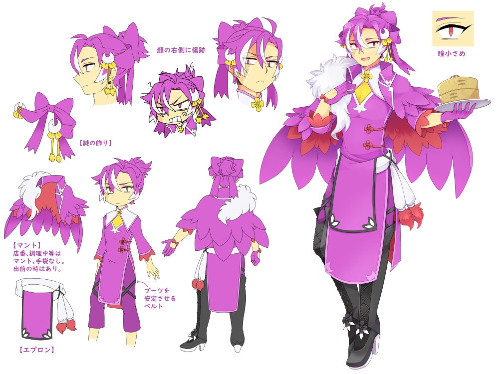 当初からドンカラス練るならチャイナっぽい感じで練りたいという願望(?)があったのと月の形の装飾品ってなんかアローラ感あるよね~(?)とか思ってたのとで頭の謎の飾りは初期からほぼ変わってないですね。スリットが片側のみでチャイナというよりロングコートっぽかったのでもっと足が